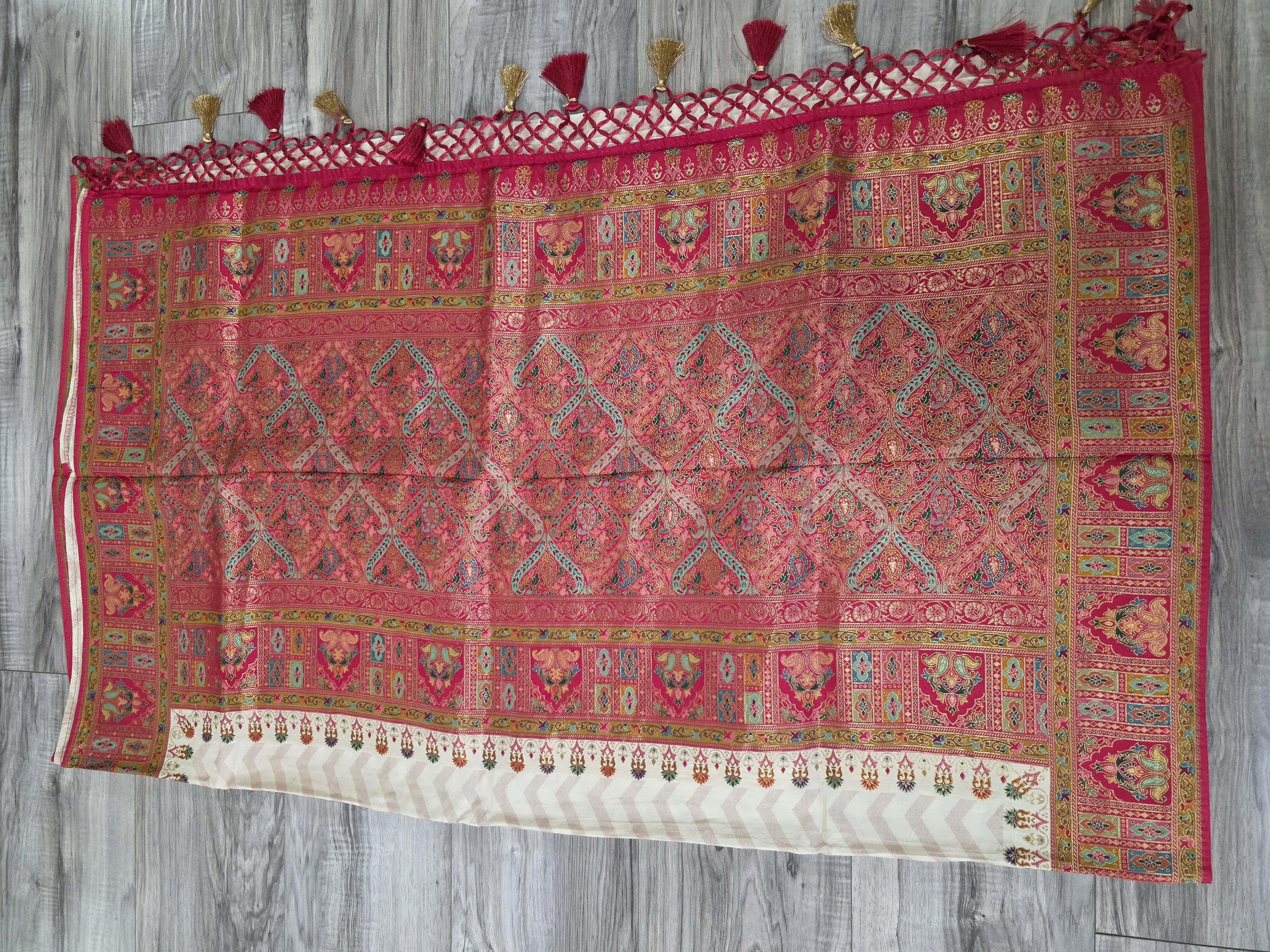 This elegant ensemble features a cream Banarasi silk sari with a modern chevron pattern, accented by a richly detailed pink and gold zari border and matching blouse.