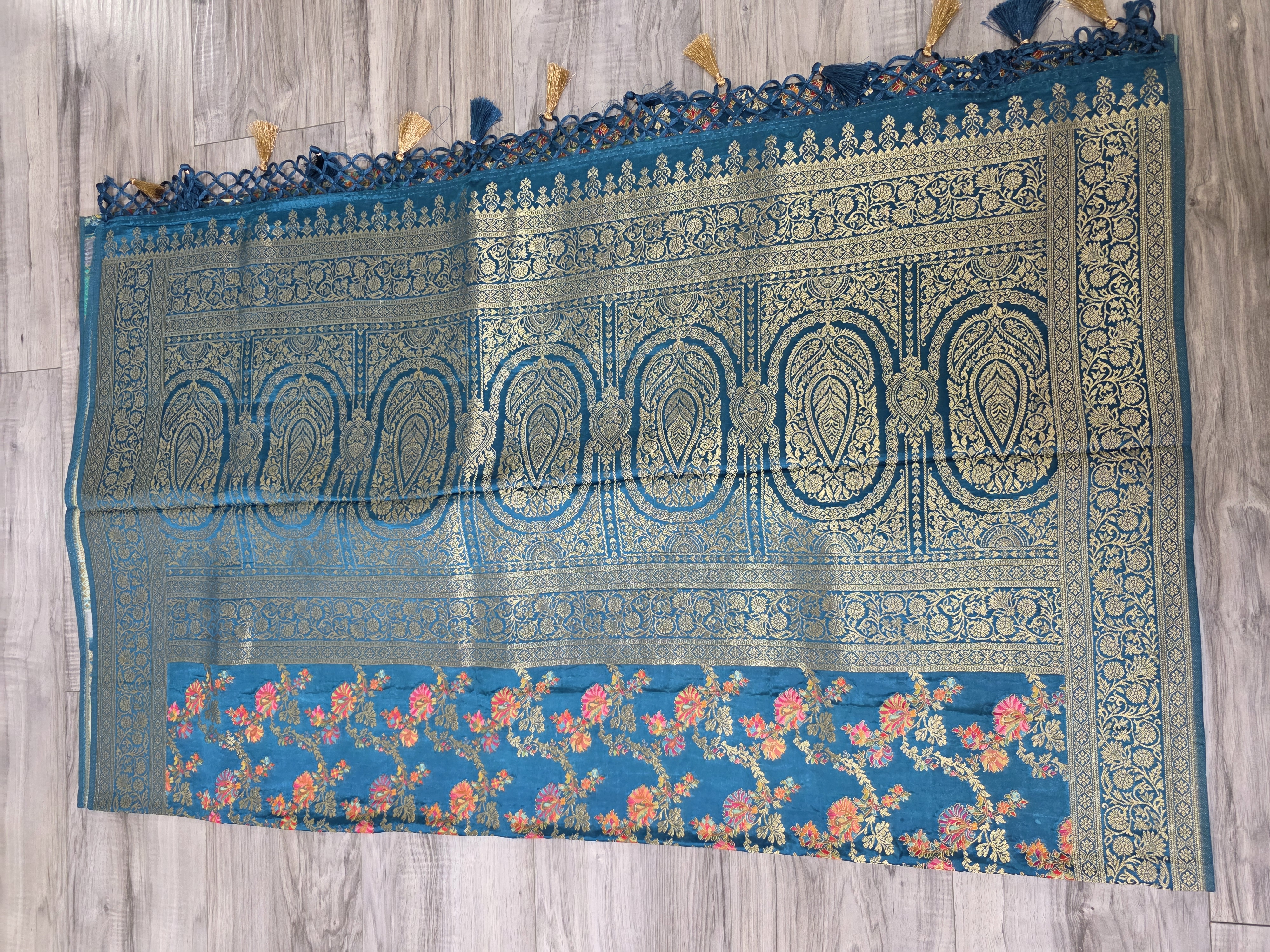 An elegant teal Banarasi silk sari featuring intricate floral gold zari work and a traditional palla, styled with a matching embroidered blouse and classic gold jewelry.