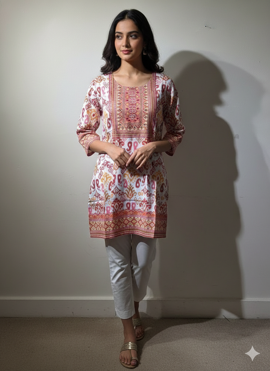 This is a sophisticated cream Banarasi position silk sari adorned with vibrant multi-colored floral butis and a traditional pink-accented zari border.