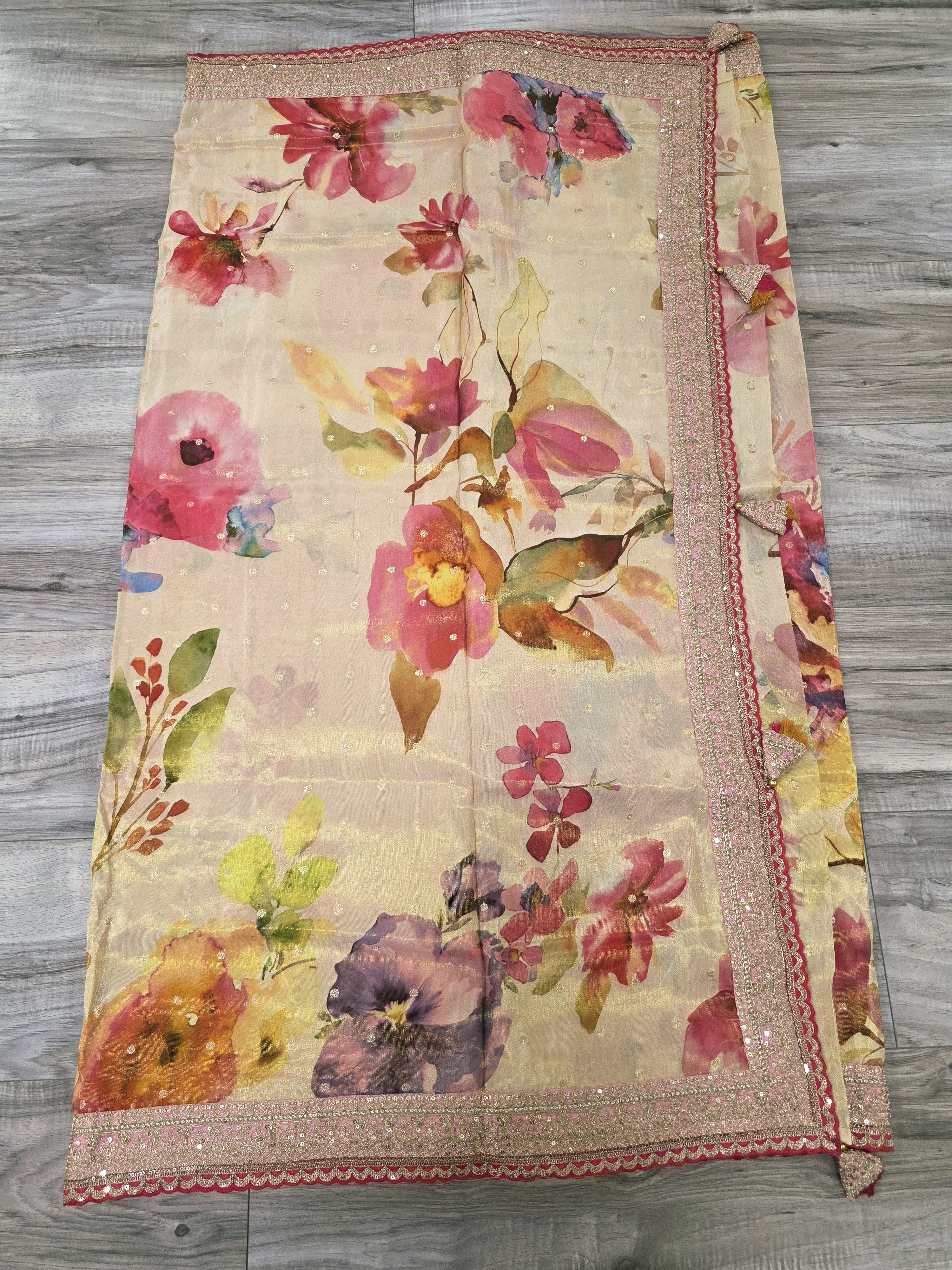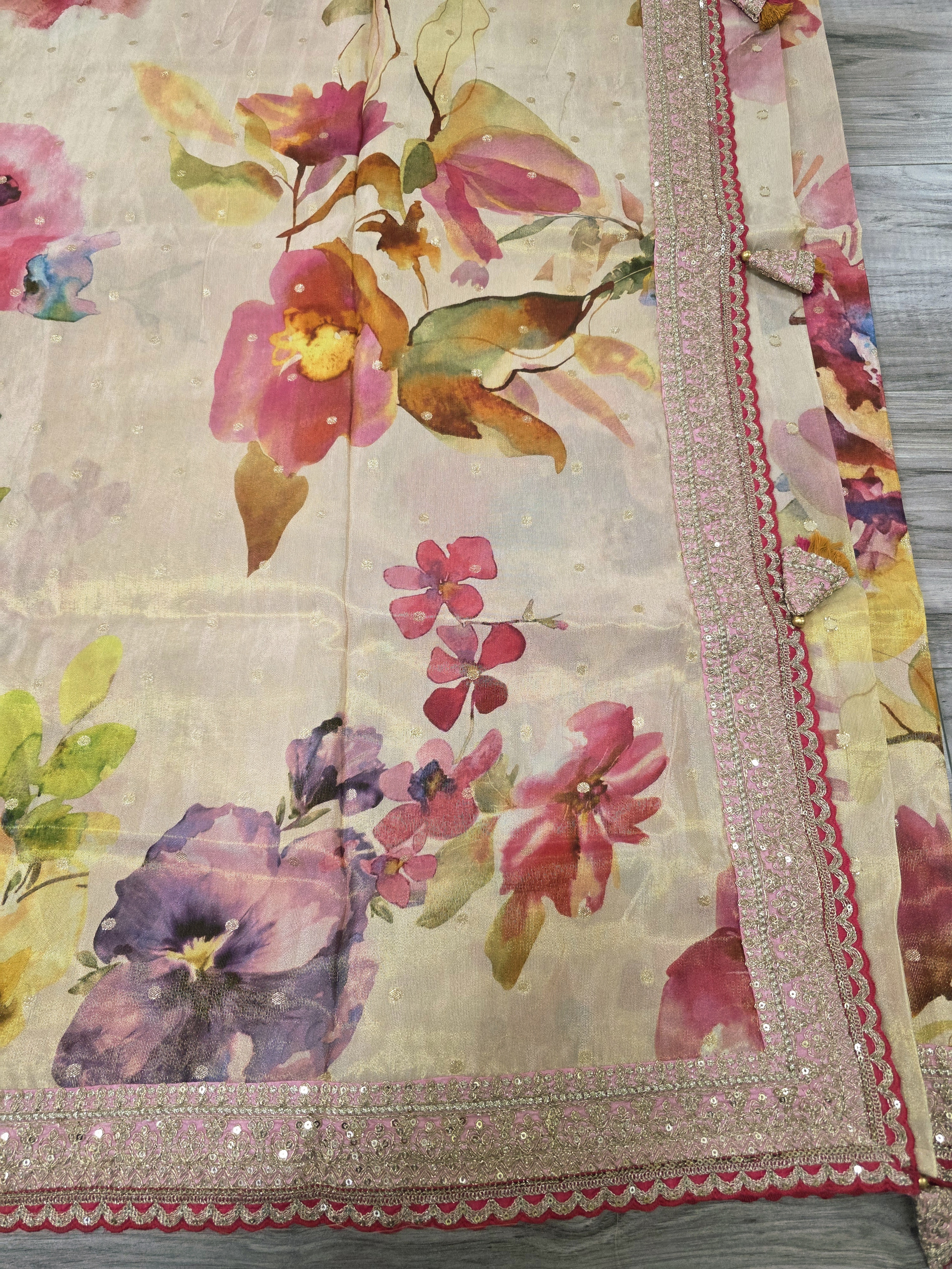 This is an elegant peach banarsi tissue organza saree featuring a vibrant multi-color floral print, finished with a delicate sequin-embroidered border and paired with a matching embellished blouse.