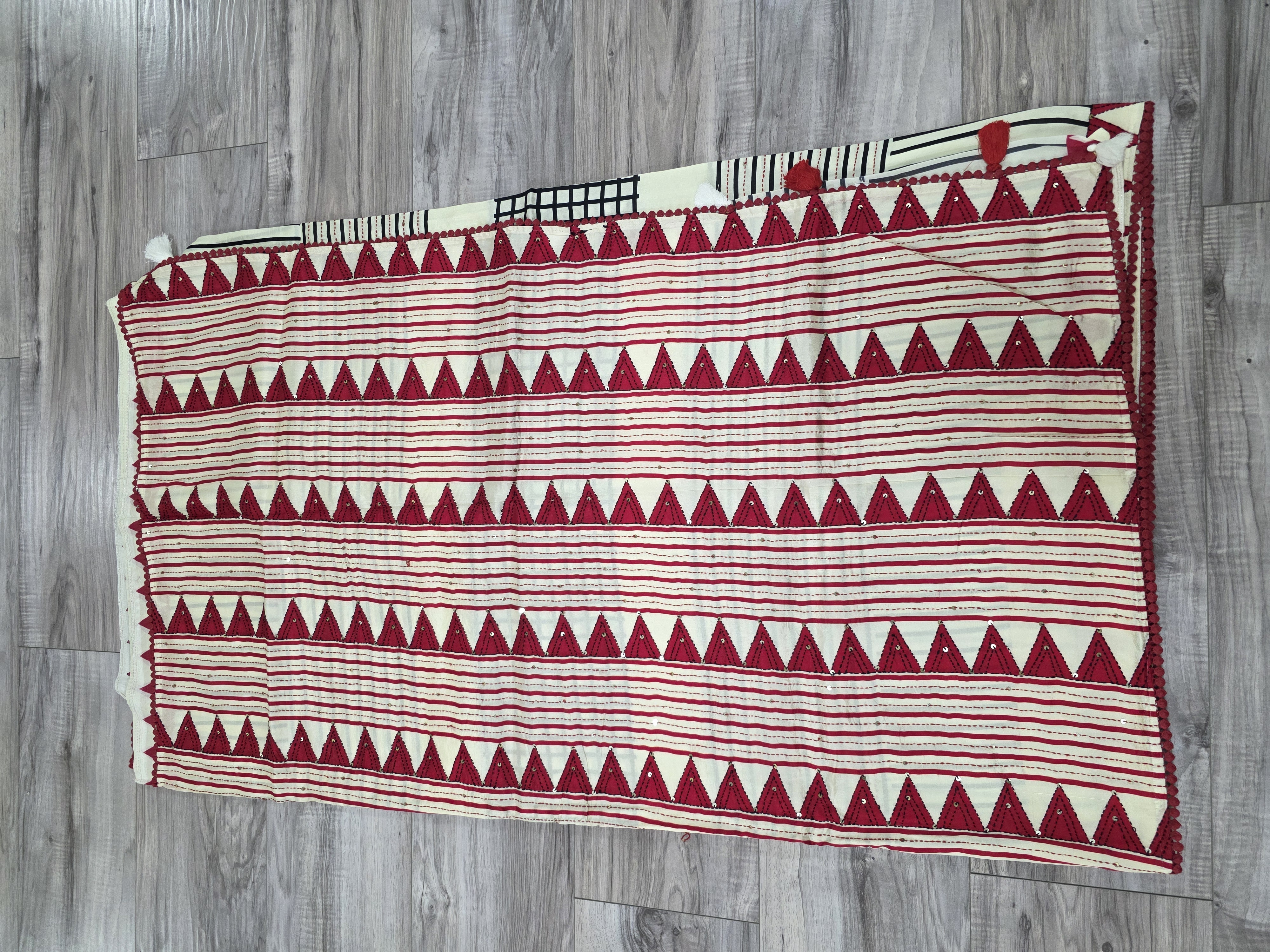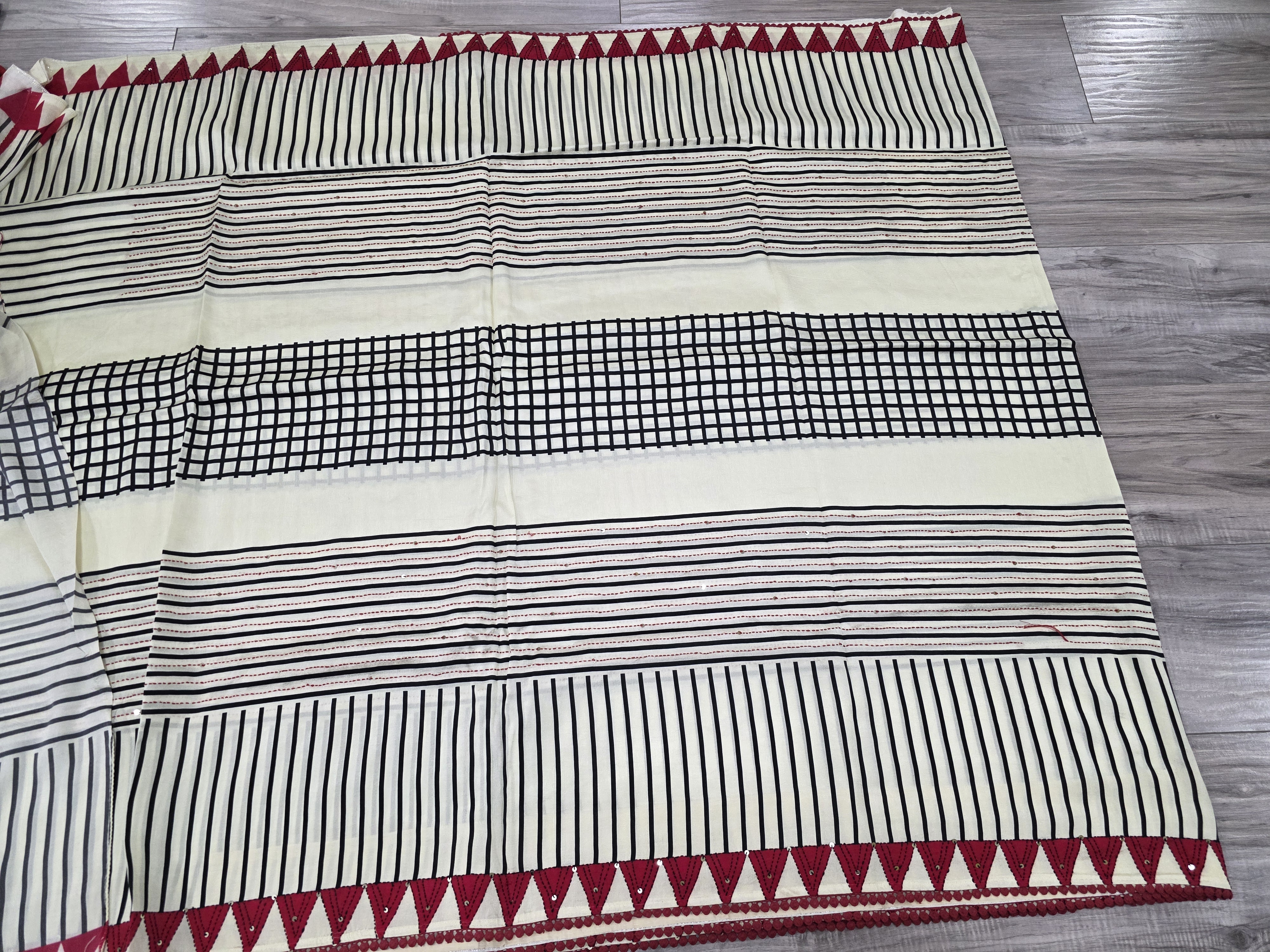 A modern, handloom-style sari featuring a monochrome geometric-striped body paired with a striking crimson-striped pallu and triangular border accents. Has Katha stitch and sequin work done all over