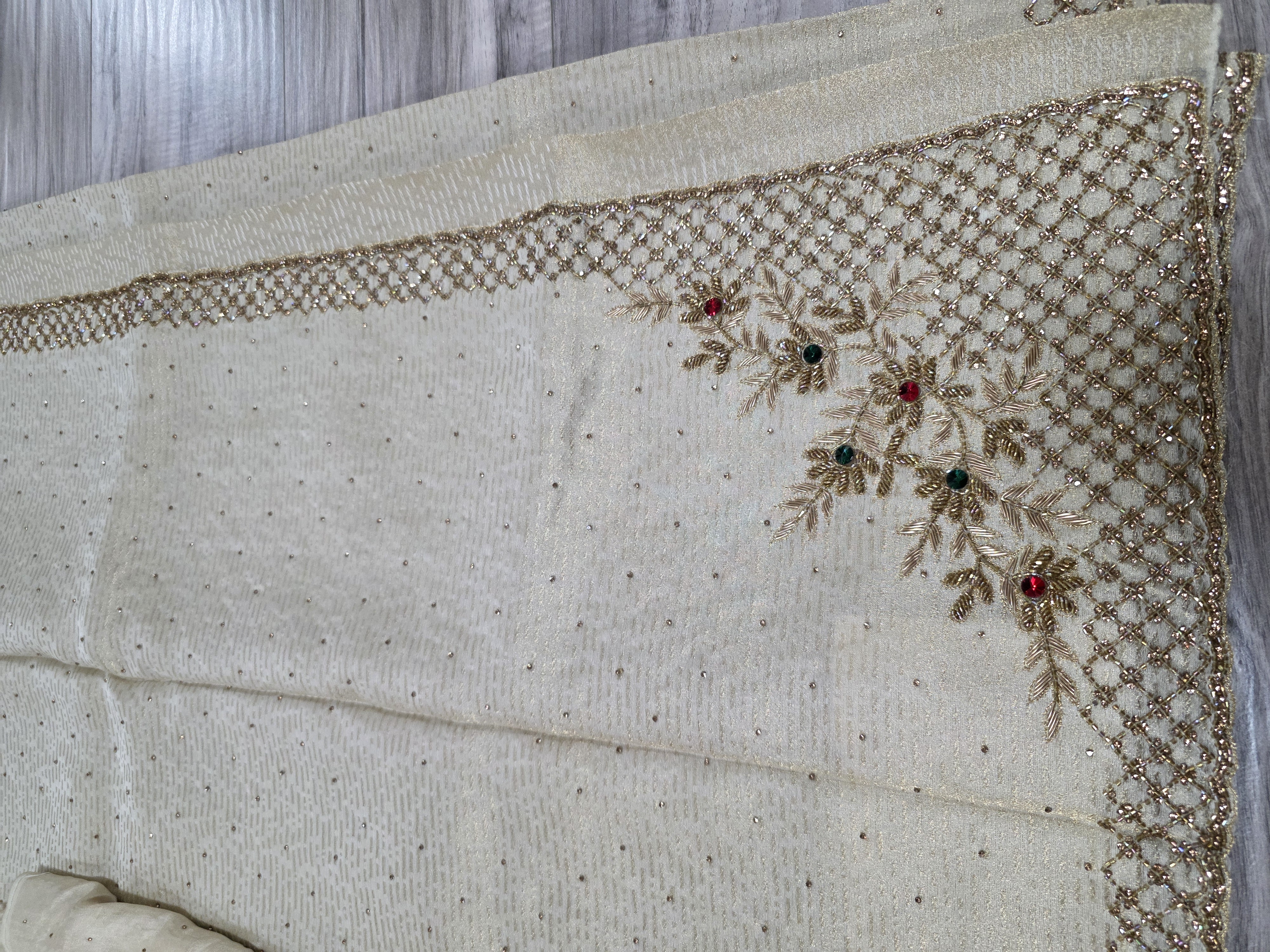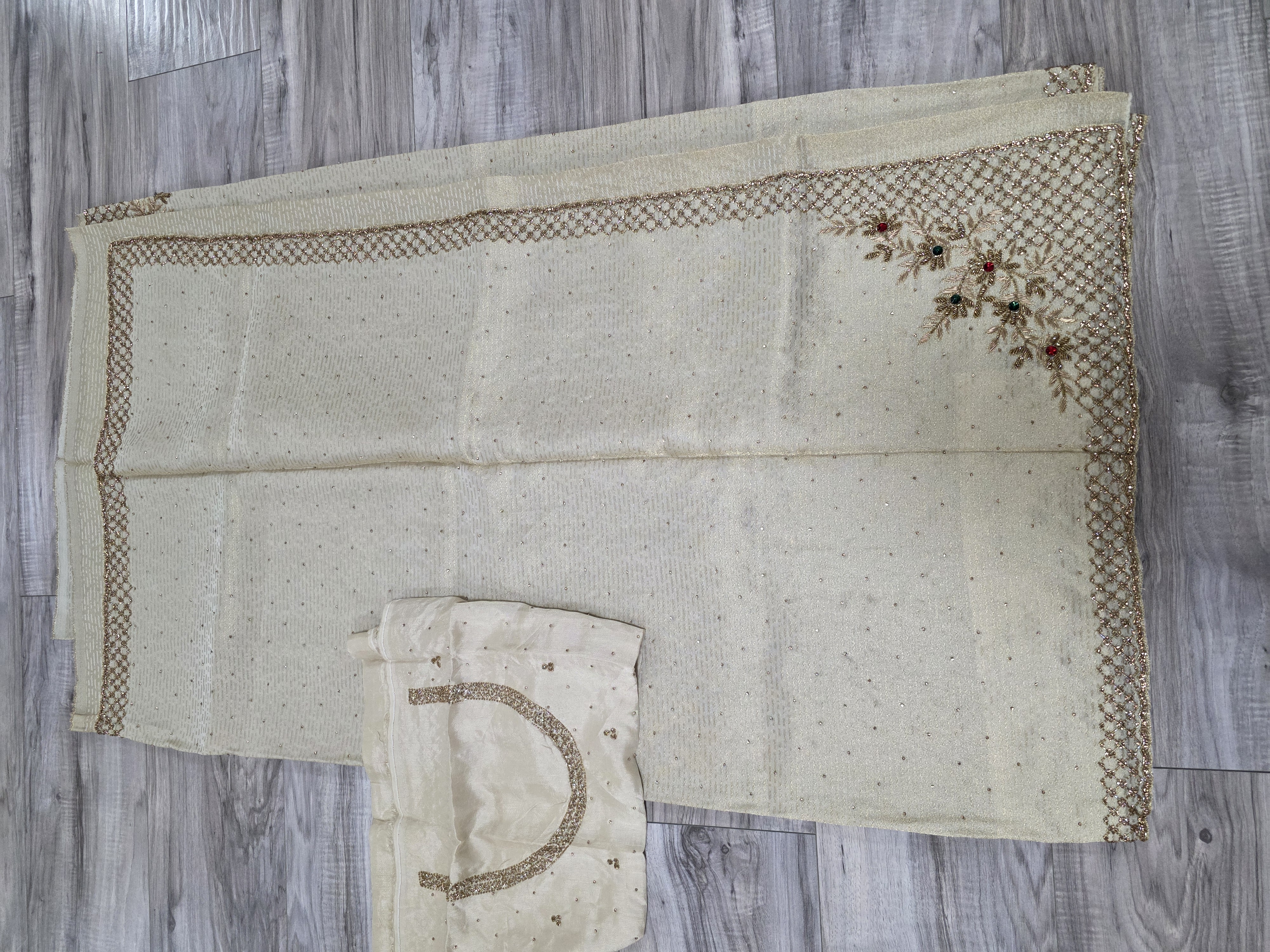 A radiant gold Kanjivaram silk tissue sari featuring intricate gold sequin embellishments and an ornate traditional border with kutdana, and color stone