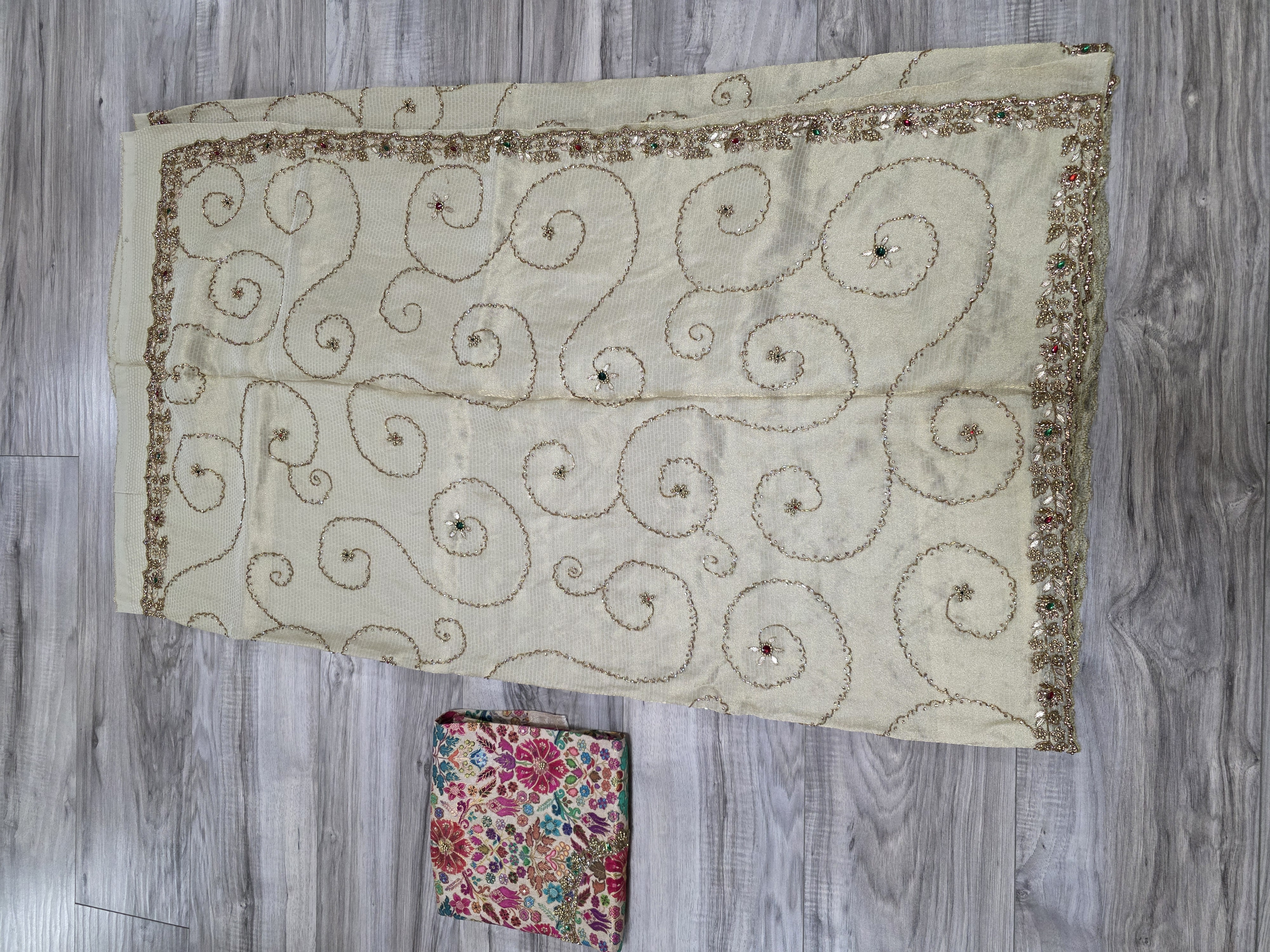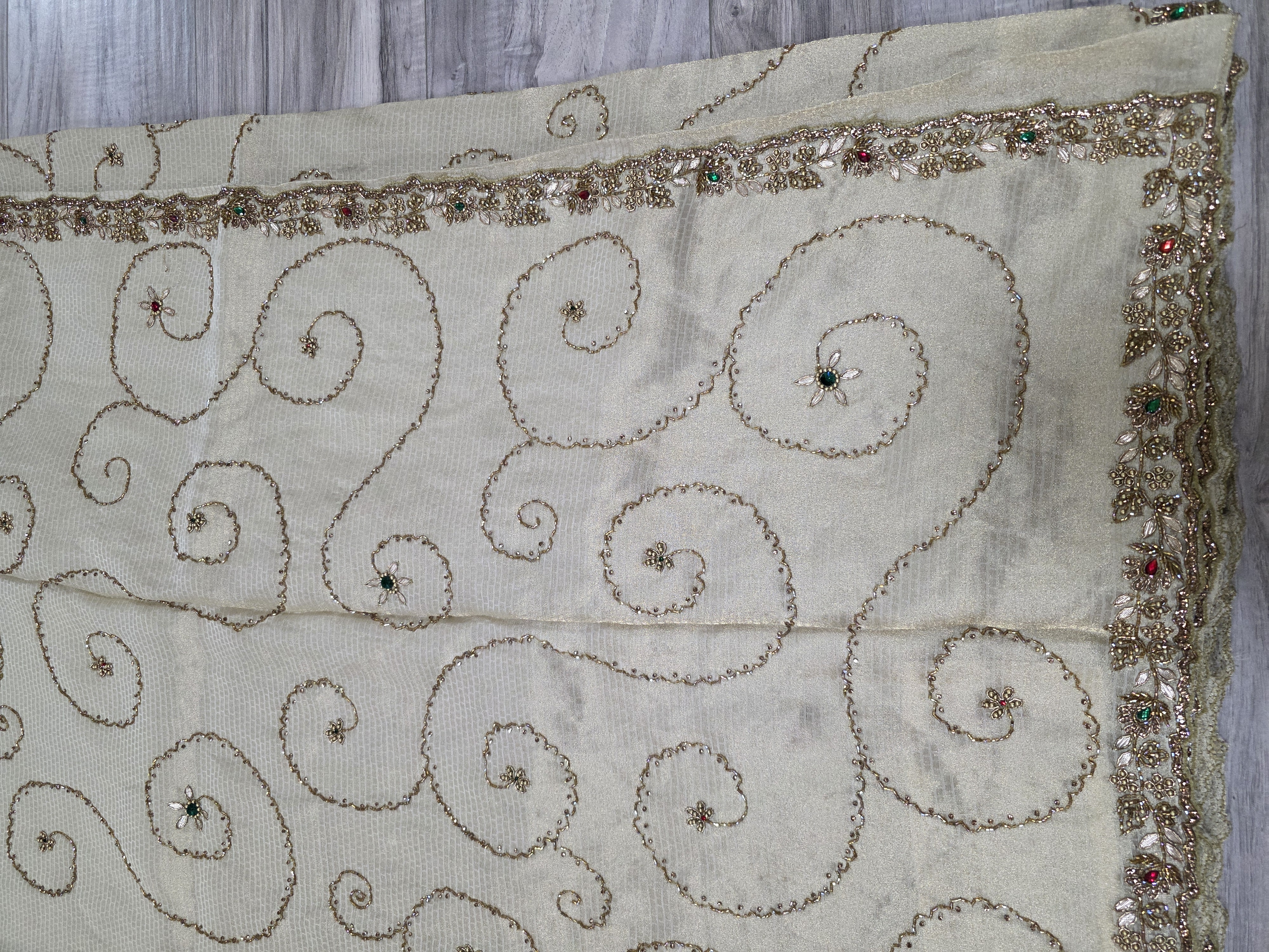 An exquisite cream Kanjivaram tissue silk saree featuring intricate gold zari swirls and vibrant color stone embellishments across the body and border.