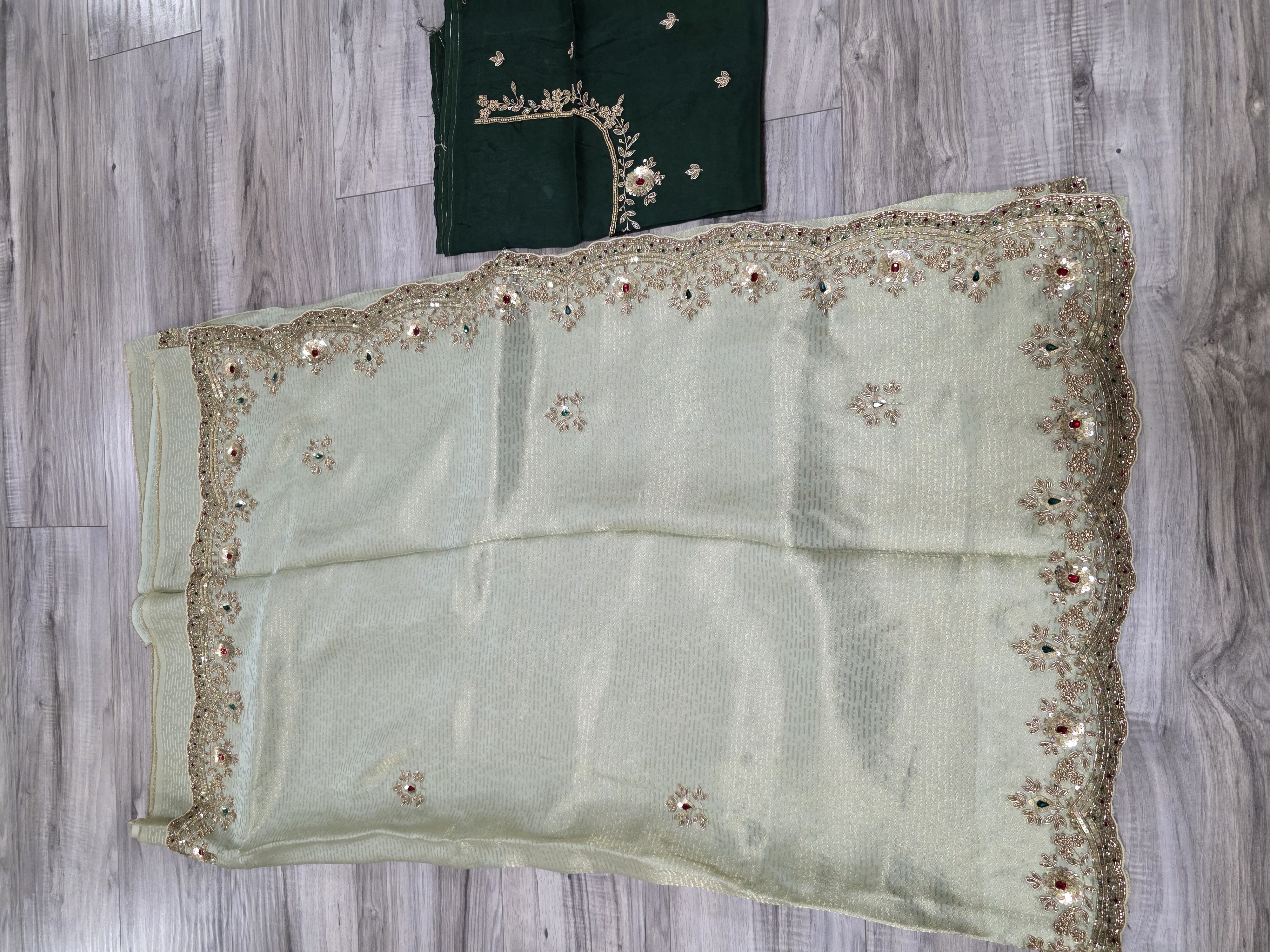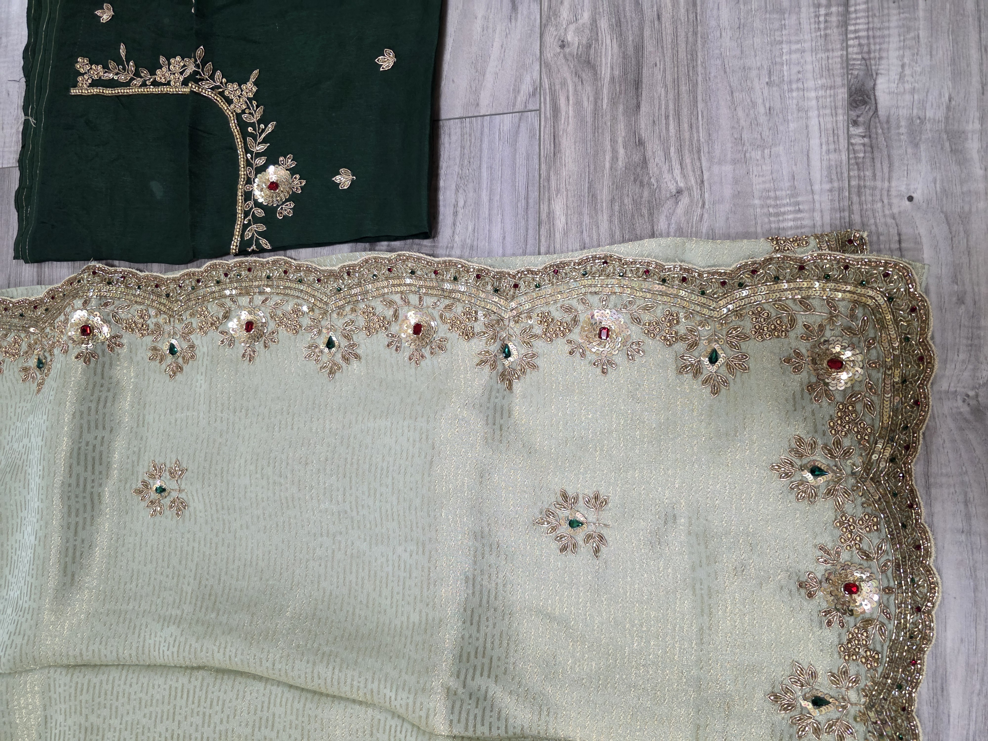 This elegant ensemble features a shimmering mint green Kanjivaram tissue silk saree adorned with intricate zari embroidery and stone work, perfectly paired with a contrasting deep emerald green velvet blouse for a sophisticated, regal look.