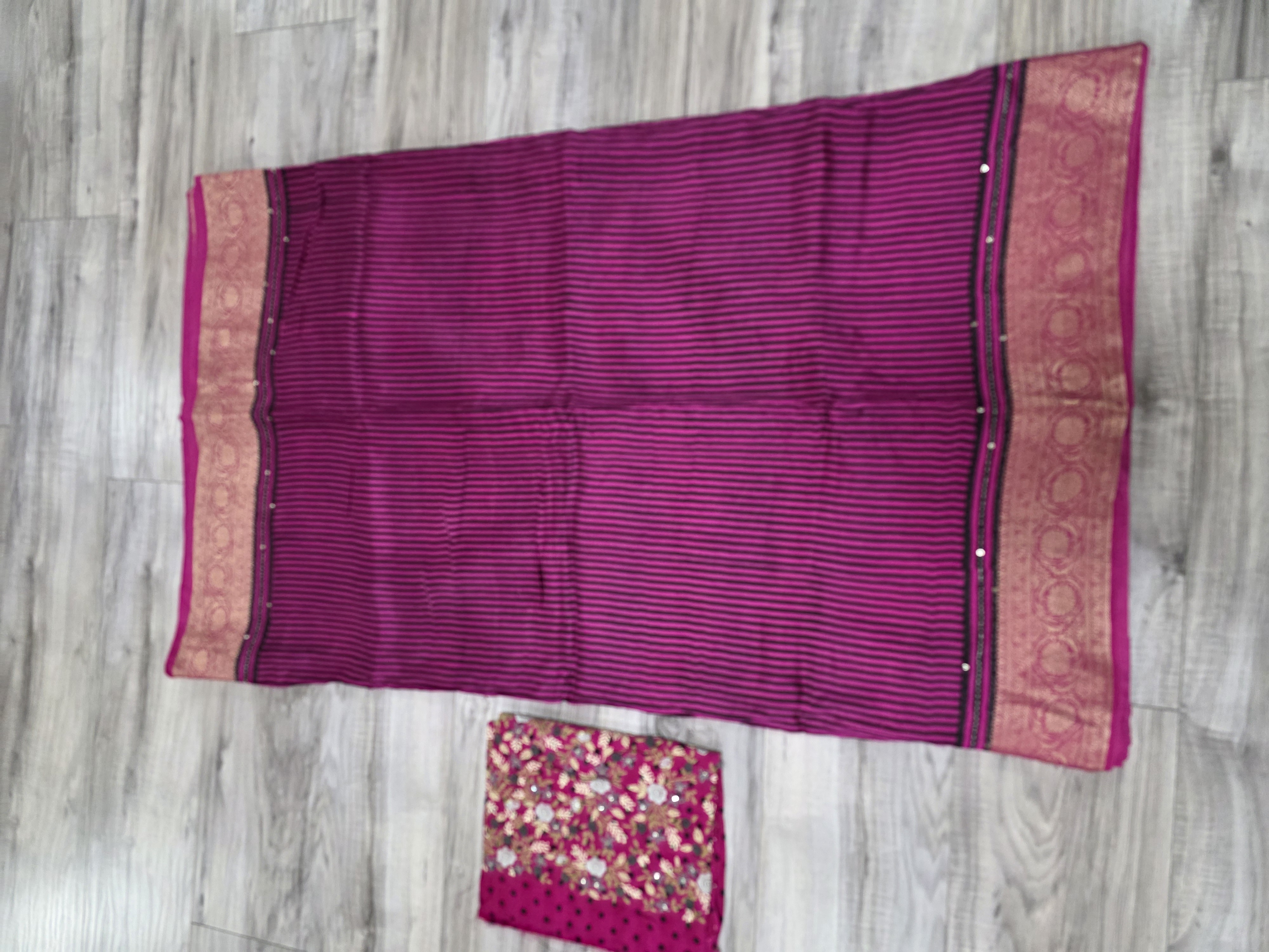 This is an elegant magenta dola silk saree featuring vertical stripes, a metallic zari border, and traditional circular motif patches, paired with a matching embroidered blouse.