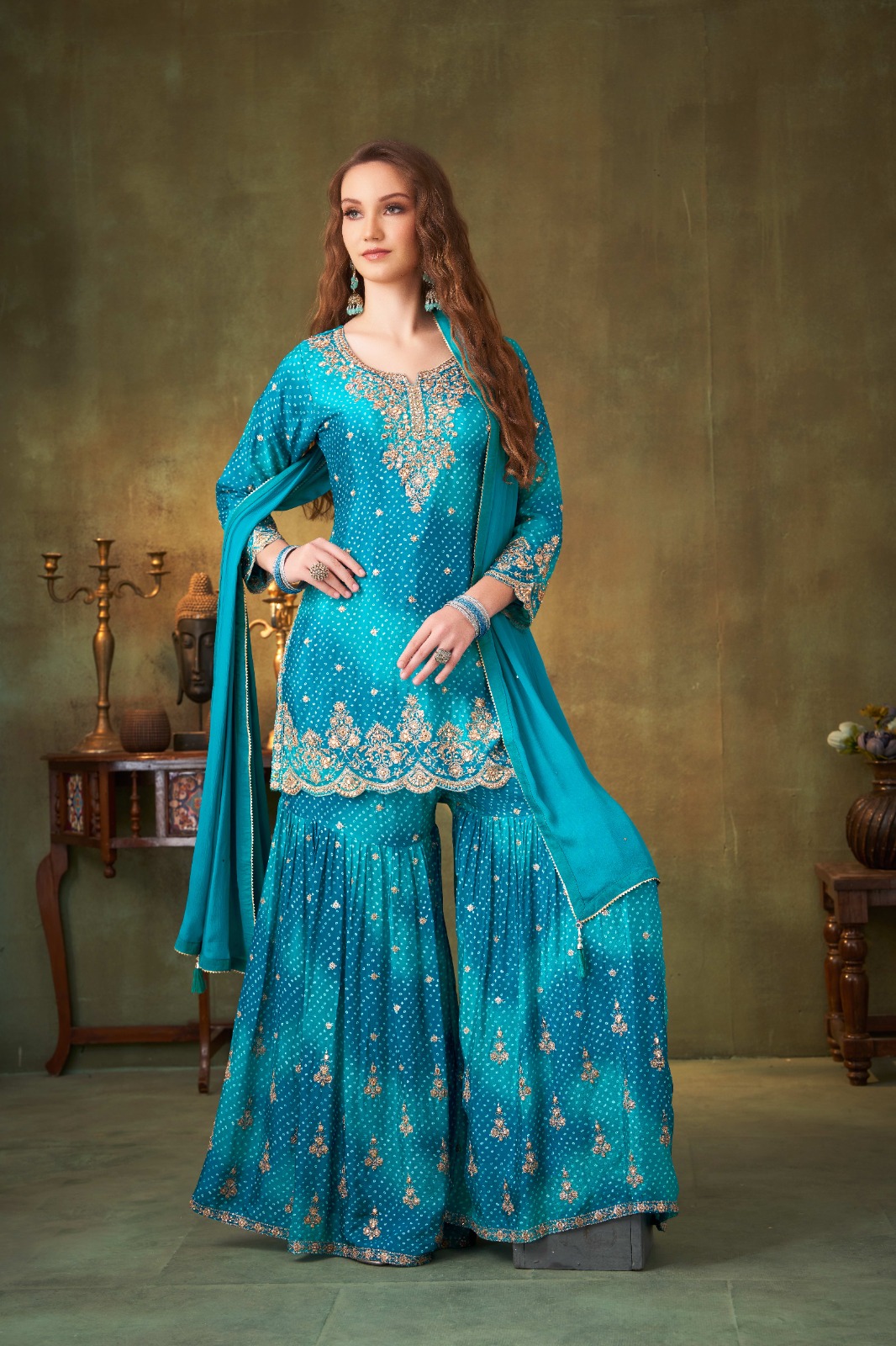 Floral print kurti in rayon fabric. Light thread , sequin and kutdana embroidery in the front