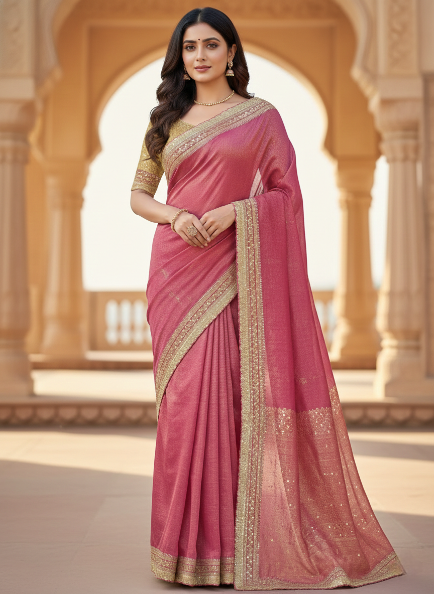 This elegant ensemble features a rose-pink Banarasi tissue silk saree characterized by its subtle metallic sheen and a delicate zari sequin border.