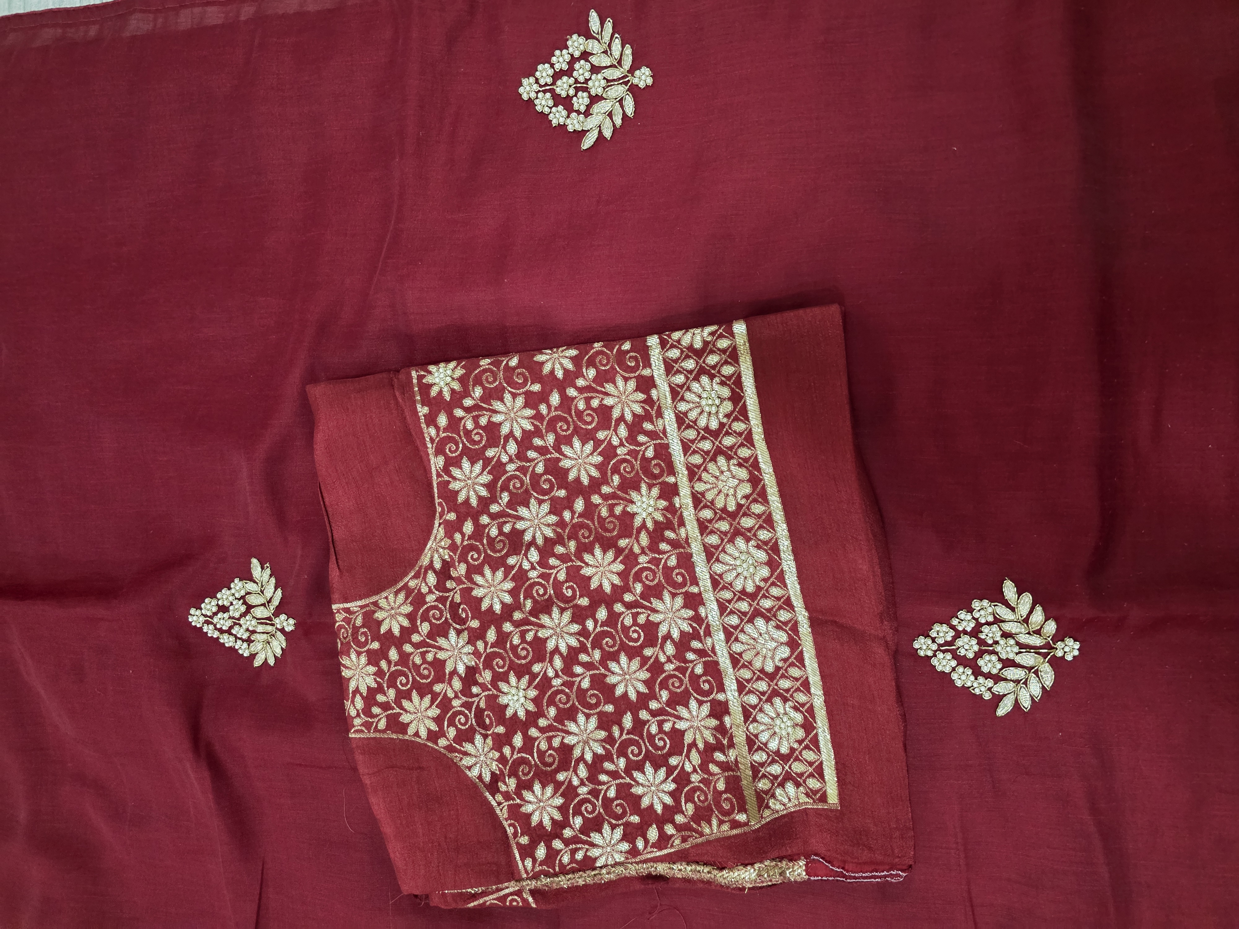 A deep maroon georgette sari featuring delicate gold floral embroidery, paired with a matching sleeveless embellished blouse for a sophisticated, traditional look.