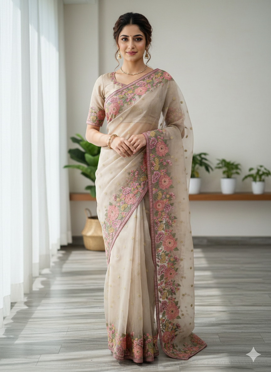 An elegant dusty pink organza saree featuring intricate floral thread embroidery in shades of pink and green, paired with a matching embroidered blouse.