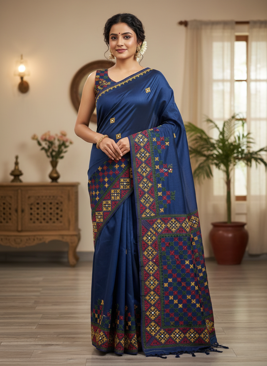 A minimalist cream silk saree featuring a delicate red embroidered border and an ornate pallu with colorful geometric diamond-patterned threadwork.