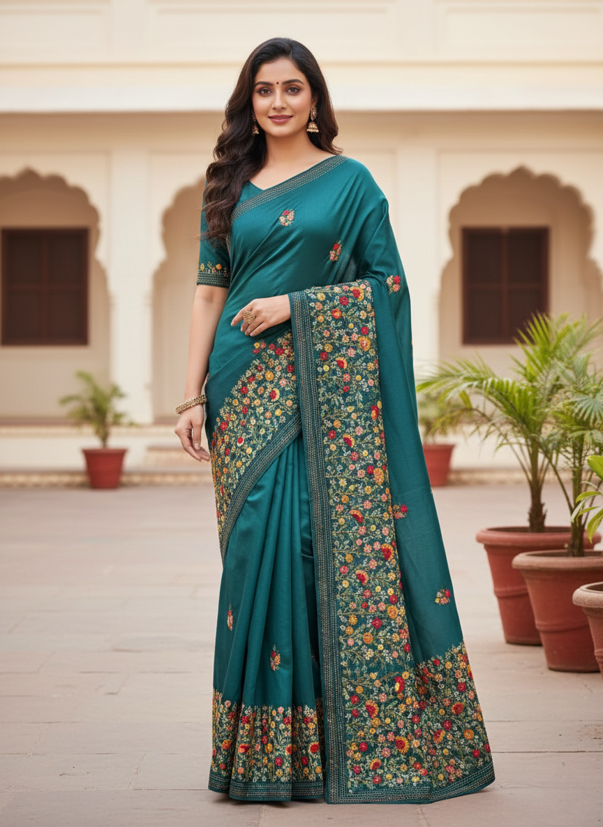 An elegant textured saree featuring delicate floral embroidery and a scalloped border, paired with a matching embroidered blouse for a sophisticated ethnic look.