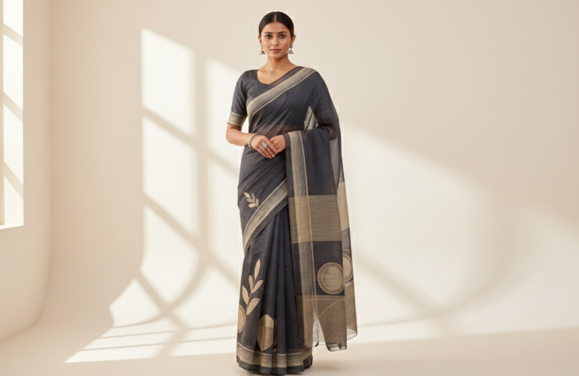 An elegant slate-blue linen-blend saree featuring light teal floral motifs, a matching blouse, and a refined silver border.