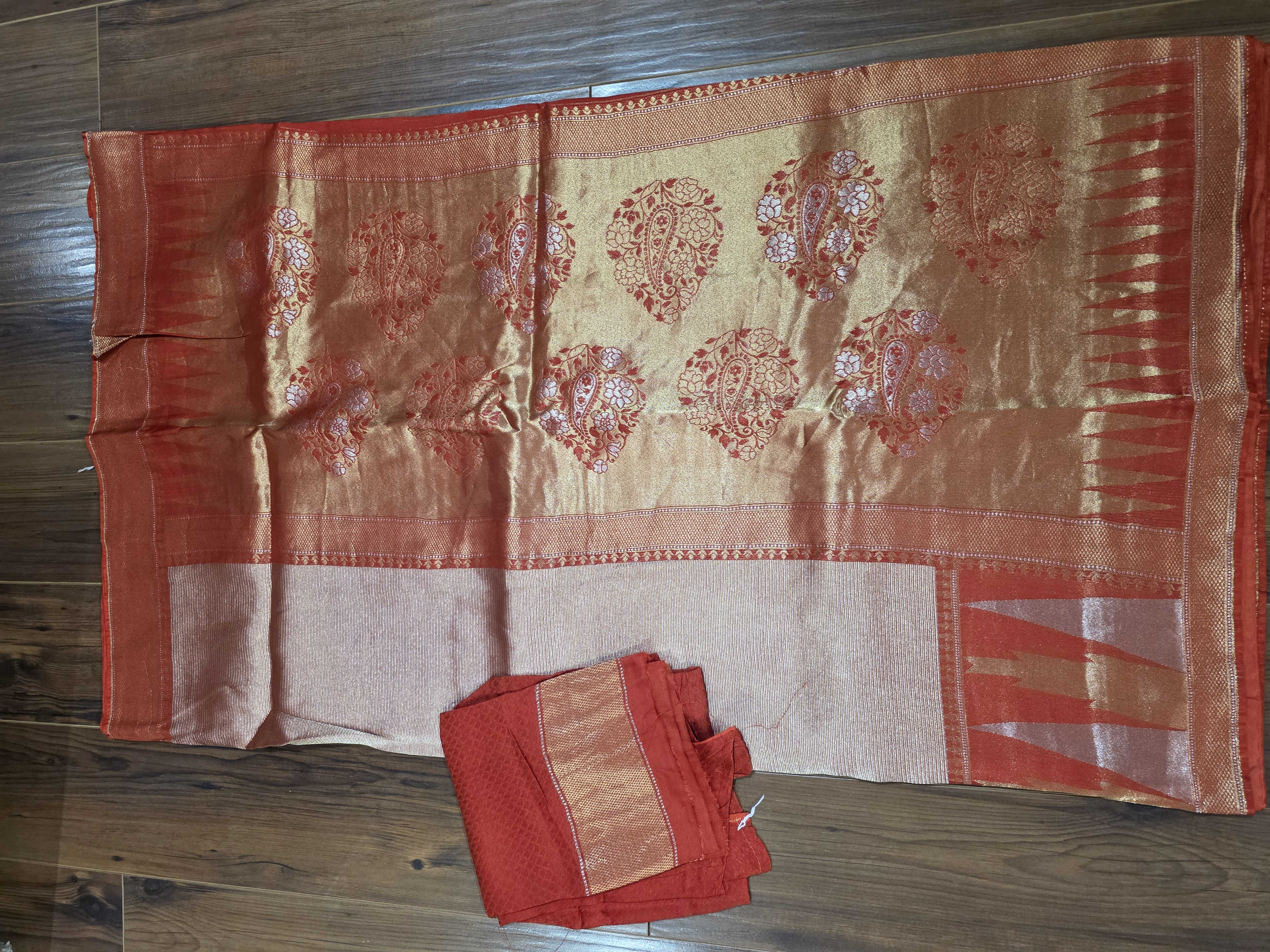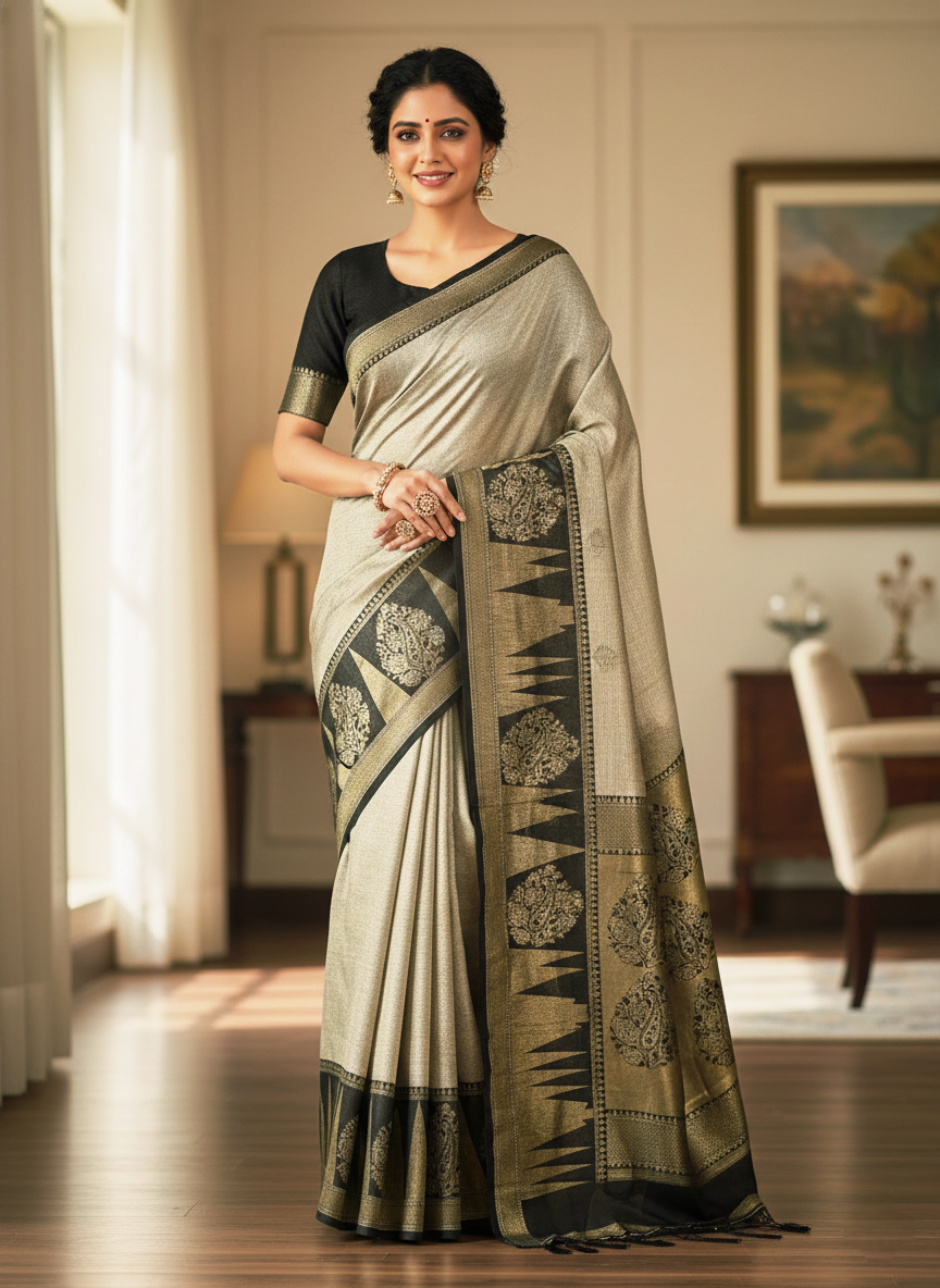 A sophisticated cream-colored sari featuring a bold black and gold zari border with intricate temple and paisley motifs, paired with a matching black blouse.