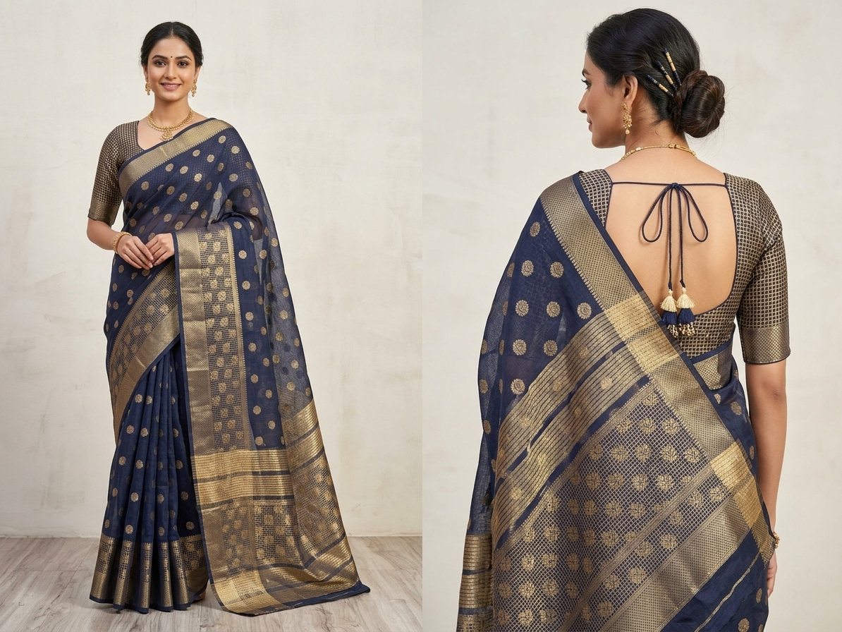 A luxurious, lightweight alternative to pure silk, Kanjivaram art silk saris feature vibrant synthetic fibers woven with intricate zari patterns to mimic the regal heritage of South Indian temple silks.