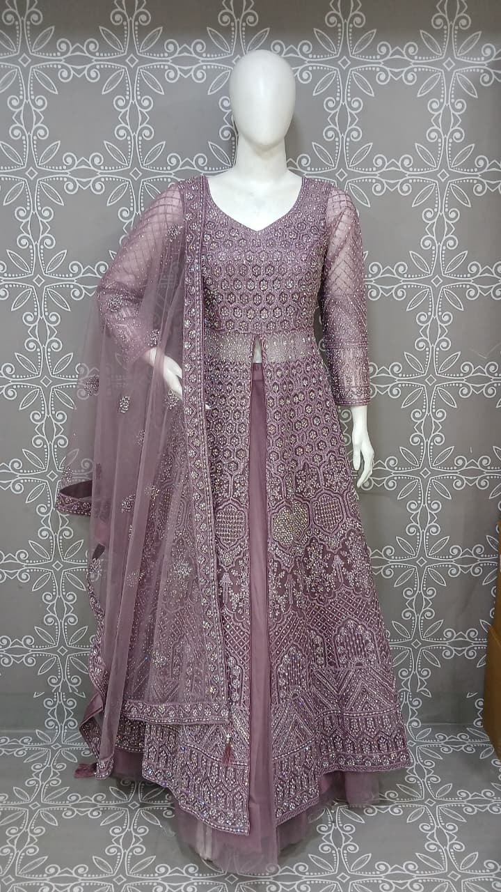 Printed multi color lehnga in crape silk fabric with grey blouse and net dupatta Blouse has fine color thread embroidery and mirror work all over