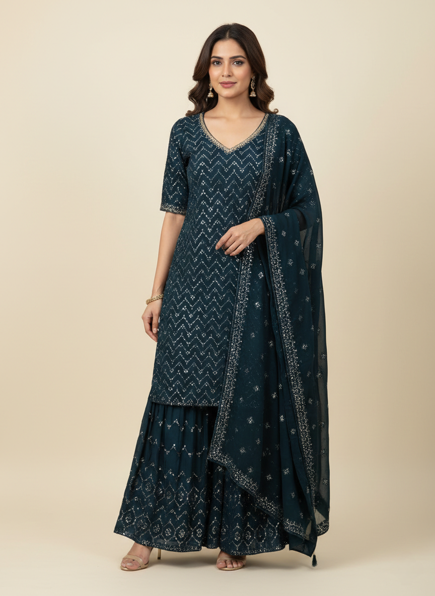 This exquisite skirt is crafted from luxurious black georgette, a lightweight and fluid fabric that drapes beautifully. The entire skirt is adorned with intricate white thread embroidery. The embroidery showcases delicate floral motifs and intricate geometric designs, meticulously crafted with fine threads and beads. This stunning lehnga set is perfect for special occasions and will make you feel like royalty.