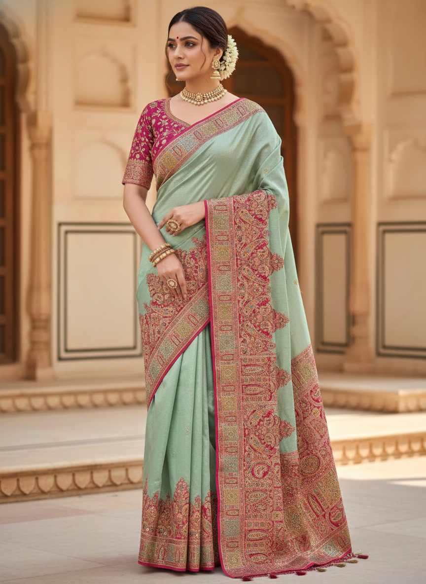 Fancy lehnga in mustard yellow gorgett fabric with mirror on blouse and dupatta. Fine thread and sequin work on the skirt blouse and Dupatta. Comes with contrast hot pink dupatta made in net material.