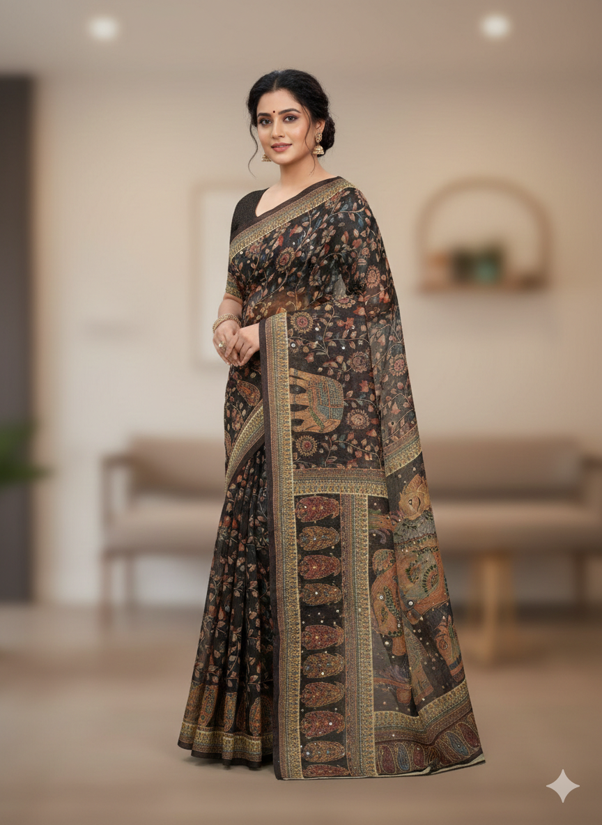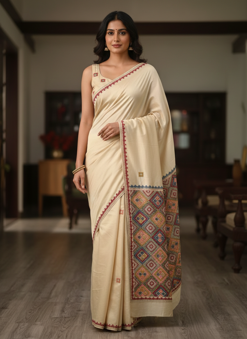 This white color fancy sari is made in satin crape fabric with multi color swarovski work all over . Blouse has work done in the back and sleeves.