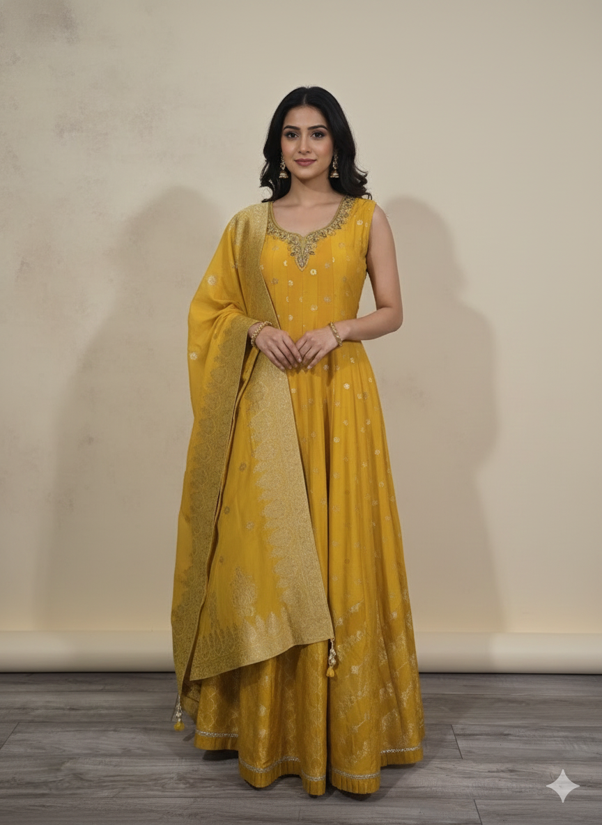 This Crop top,skirt and jacket set is made in pure chinon crape silk material. Fine pearl , sequin and kutdana work done