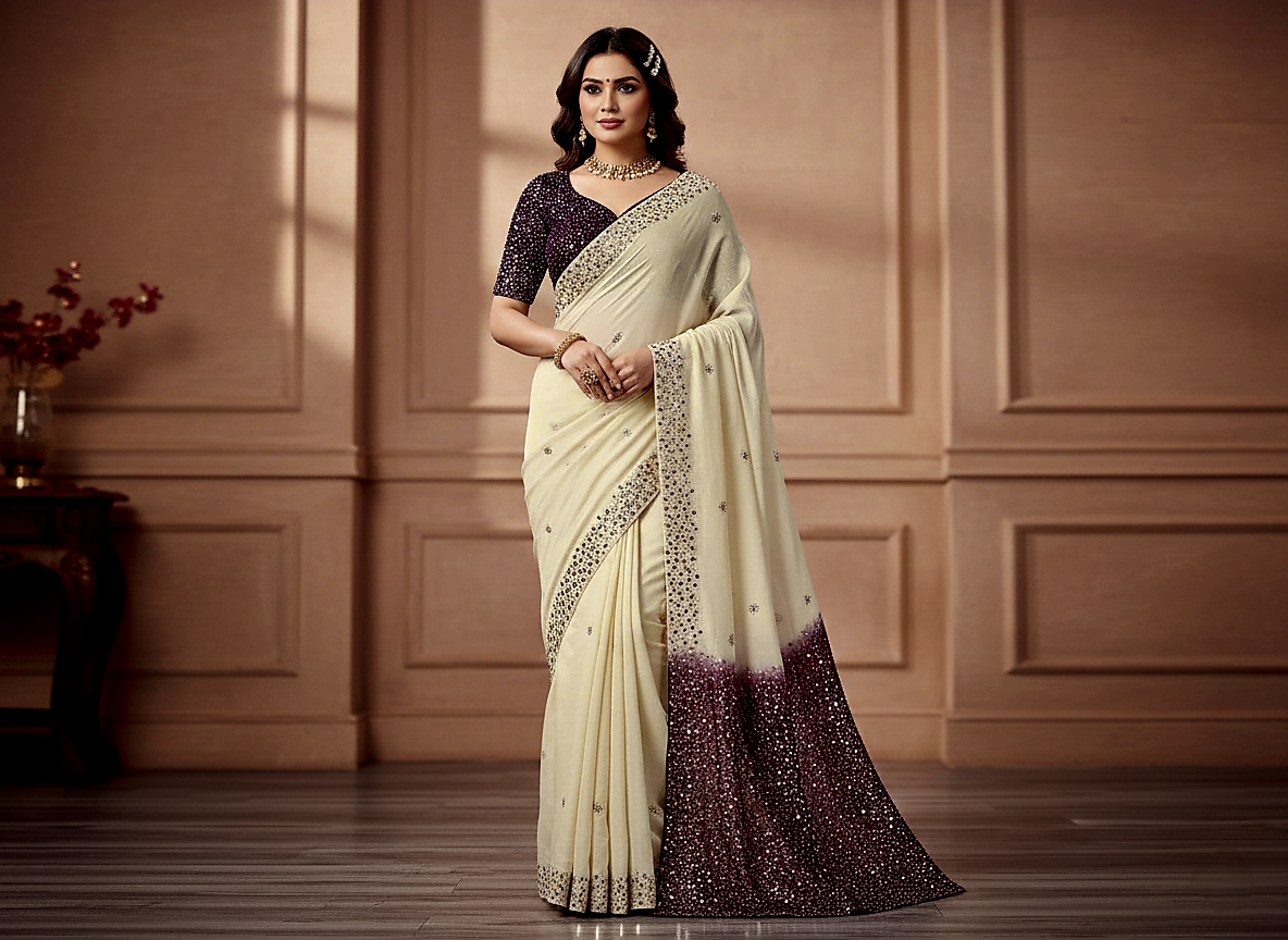 This banarsi khaddi gorgett fabric sari has antique silver weaving border, Anchal and small motifs all over. Soft and flowy fabric for easy draping