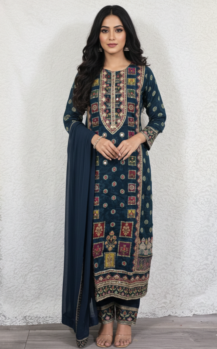 Straight Kurta Pant and Dupatta set Kurta made in soft jacquard silk material. Pant and Dupatta done in soft tissue organza material.