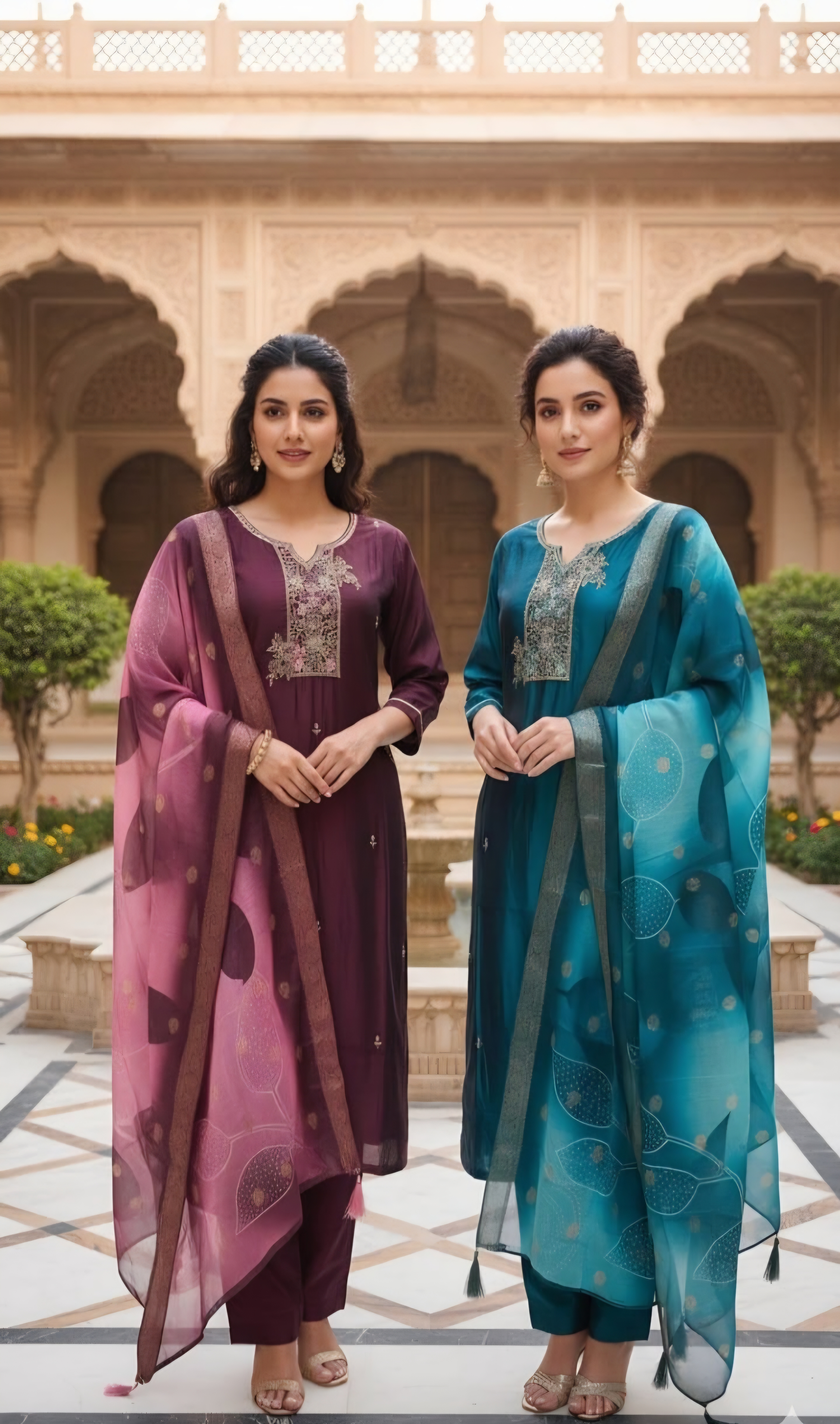 This floral print kurta with sharara set is made in pure crape silk material. Kurta and sharara has fine sequin work done around. Dupatta is two shaded made in pure organza with zari and sequin work done around